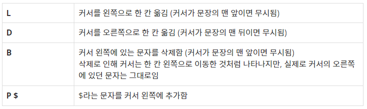 이 편집기에는 '커서'라는 것이 있는데, 커서는 문장의 맨 앞(첫 번째 문자의 왼쪽), 문장의 맨 뒤(마지막 문자의 오른쪽), 또는 문장 중간 임의의 곳(모든 연속된 두 문자 사이)에 위치할 수 있다. 즉 길이가 L인 문자열이 현재 편집기에 입력되어 있으면, 커서가 위치할 수 있는 곳은 L+1가지 경우가 있다.