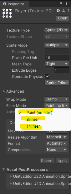 Sprite를 선택하고 Filter Mode를 선택하게 되면 위 사진과 같이 나타난다.